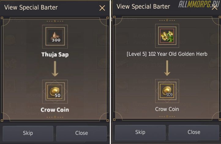 Всегда возите с собой по одной копии нижеперечисленных товаров пятого уровня для особого бартера. Эти предметы дают большое количество монет ворон.