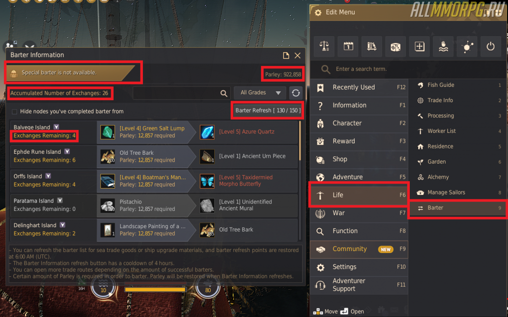 Чтобы открыть меню бартера, нужно нажать ESC > Ремесла > Бартер. Важные элементы меню: