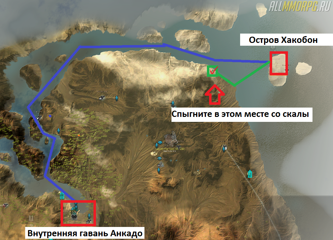 В порту Неккадо отзовите из кают моряков и заполните трюм товарами пятого уровня. Отправляйтесь на остров Хакобон и обменяйте товары на монеты, выбирая сделки на 250 монет и больше. Чтобы вернуться в город, можете воспользоваться картой путешественника или спрыгнуть со скалы в указанном на скриншоте месте, а потом воскреснуть в городе. Воспользуйтесь функцией "найти и вернуть", а потом отправьте свой корабль обратно на остров Илию.