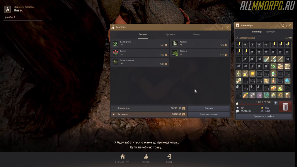 - Очищенная вода х1 (для очистки воды нажмите L и профильтруйте бутылку речной воды);