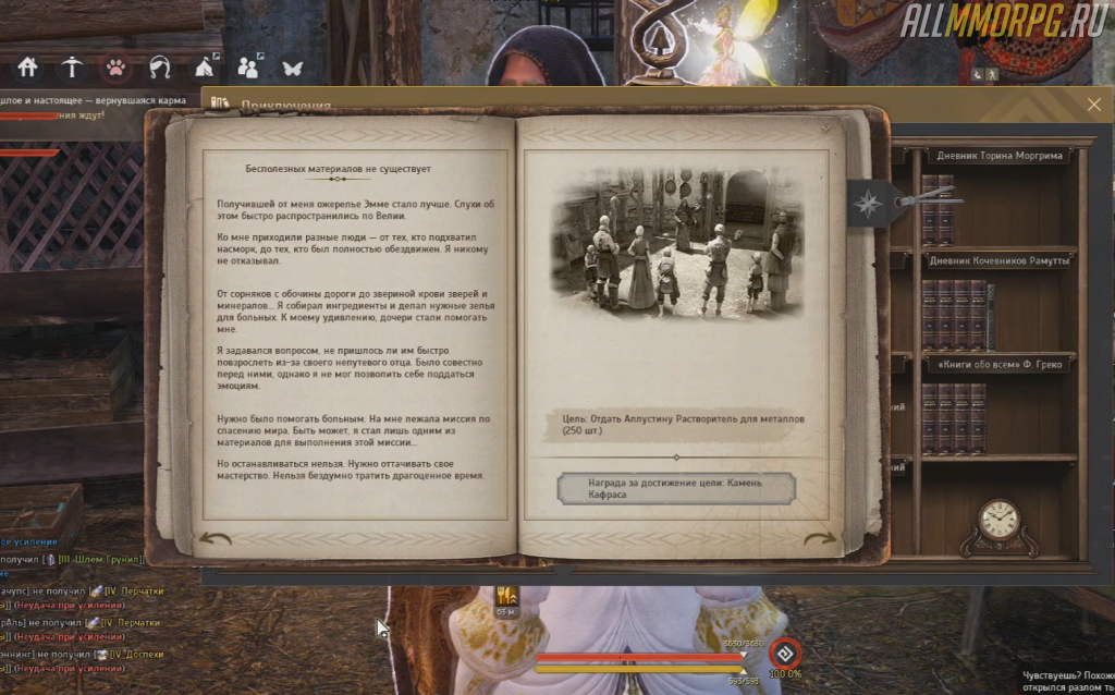 После этого вы сможете просмотреть обе книги и приступить к работе. Нажмите клавишу ESC, перейдите на вкладку "Приключения" и выберите "Книжная полка" - "Дневник Аллустина".
