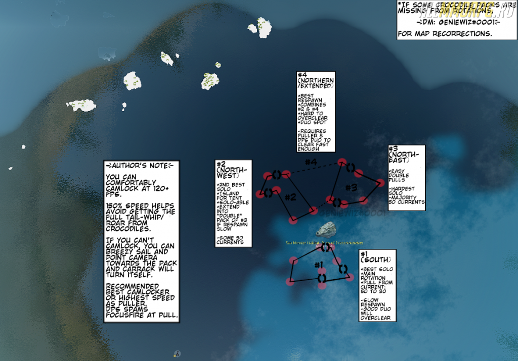 Щелкните по картинке ниже, чтобы увеличить ее. Карта с точками появления крокодилов была опубликована пользователем Geniewiz#0001 в Discord-канале, посвященном судоходству в BDO. Количество добычи с крокодилов можно рассчитать по этой таблице.