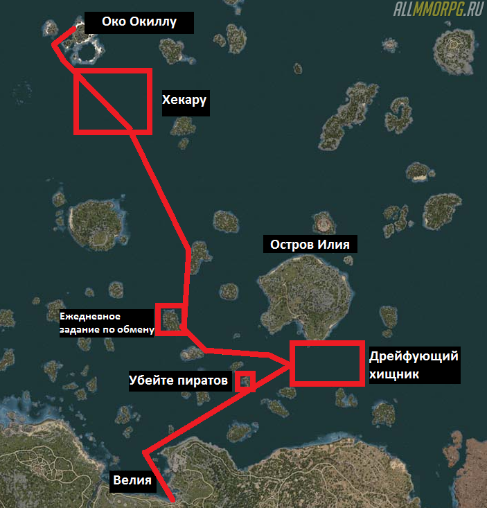 Взяв все задания в Велии, отправляйтесь на остров Илия. По дороге загляните на остров Аракиль и перебейте пиратов. К югу от острова Илия можно найти голодных дрейфующих хищников. Далее отправляйтесь на север к Оку Окиллу. На острове Войта есть еще пираты, а на остров Барэми жду недостающие товары. К югу от Ока Окиллу водятся голодные Хекару. Убейте трех, чтобы выполнить задание Фравы.