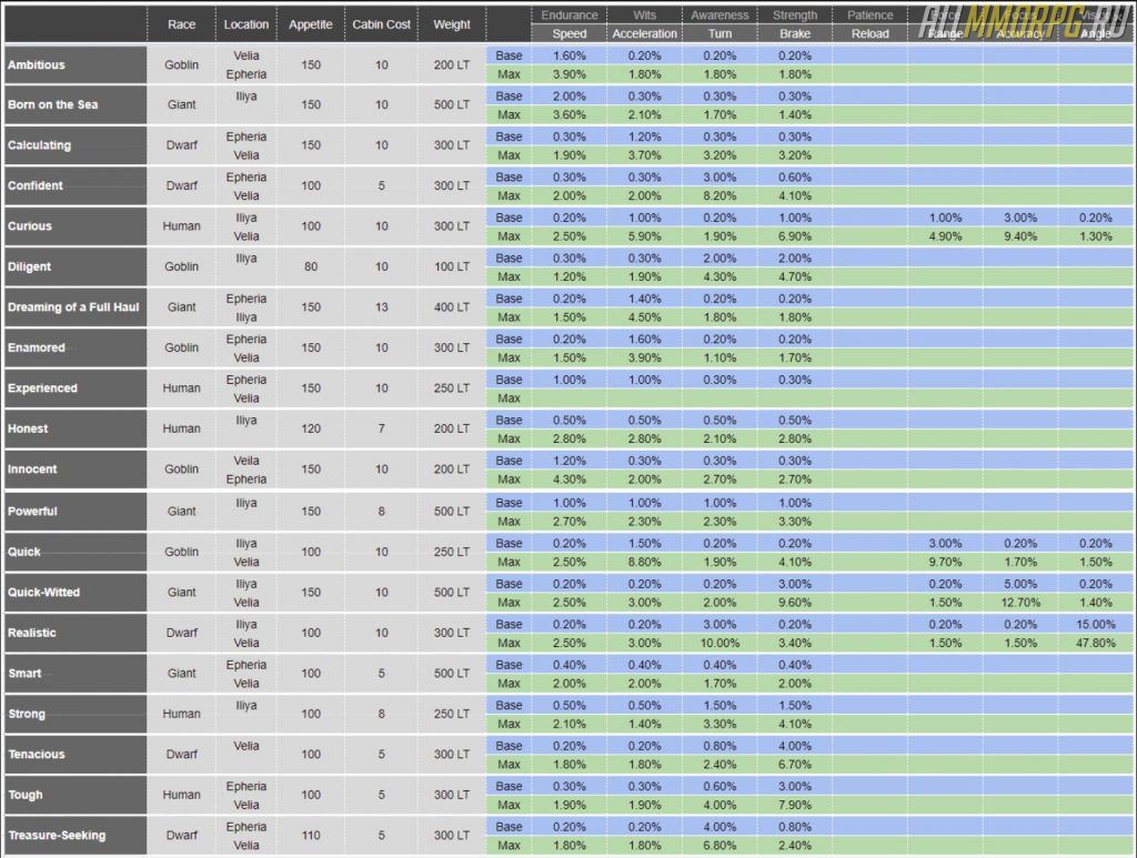 У каждого матроса есть тип, который отображается у него над головой рядом с именем. Ниже представлена таблица, в которой указаны все типы матросов и их базовые характеристики, а также бонусы, приобретаемые матросами при прокачке.