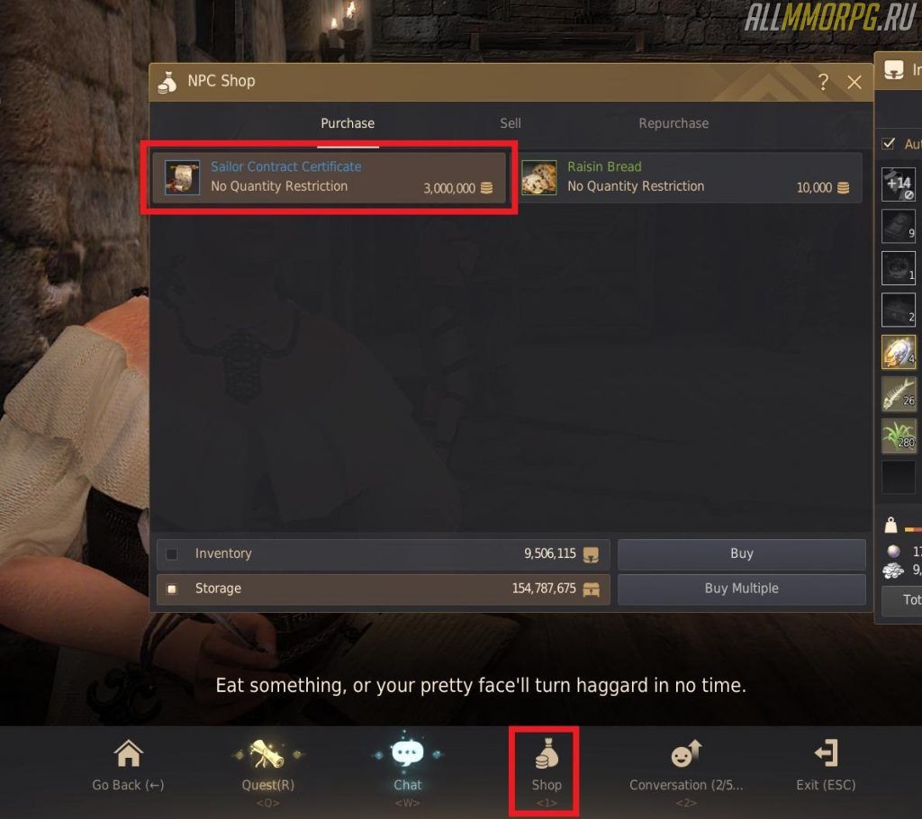 Выполнив задания, купите контракты для матросов. Каждый контракт стоит 3 миллиона серебряных. Контракты продаются у Айселин Бартелли в Велии, у Филаферто Палацио в порту Эферии и у Коикса на причале в Велии.