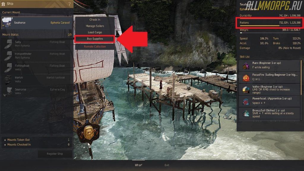 Чтобы восполнить запас, нужно наведаться к смотрителю доков. Также ваша команда может собирать припасы на островах и с некоторым шансом восстанавливать запас еды на корабле. На кораблях второго и третьего ранга существует возможность восстанавливать запасы с помощью Сути ветра. При использовании предмет исчезает.