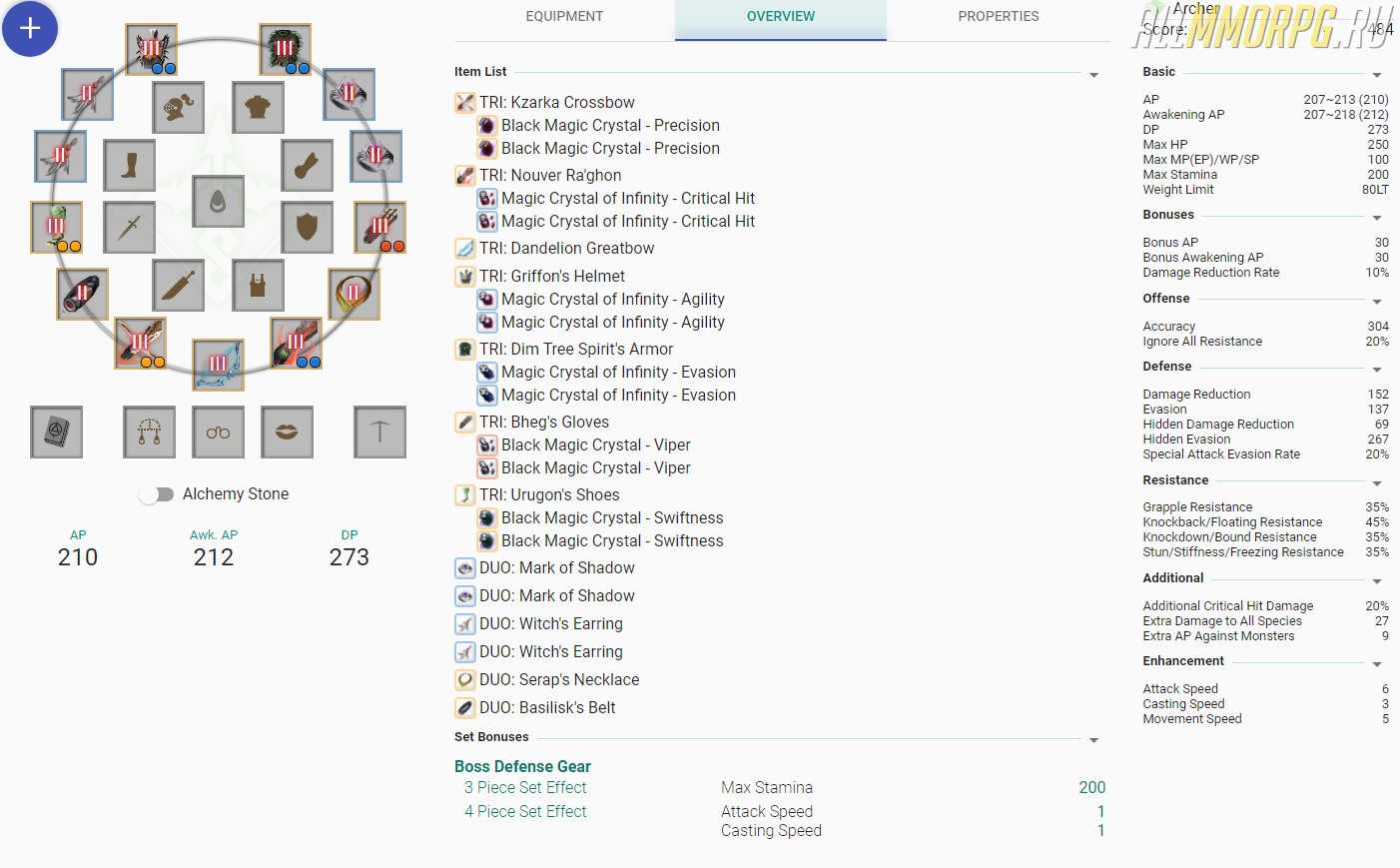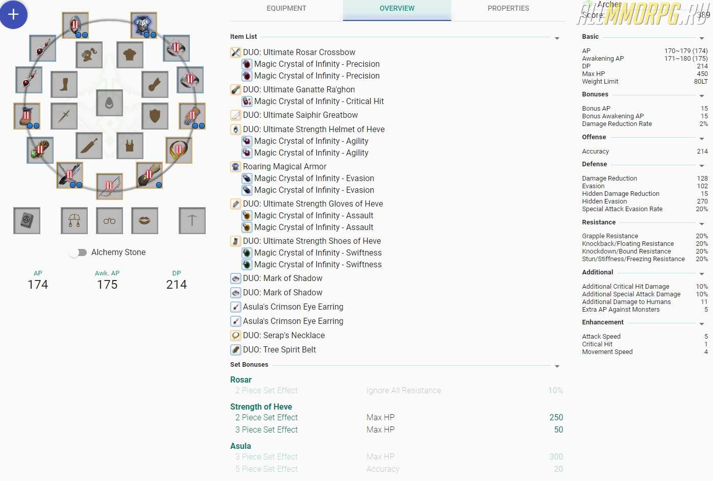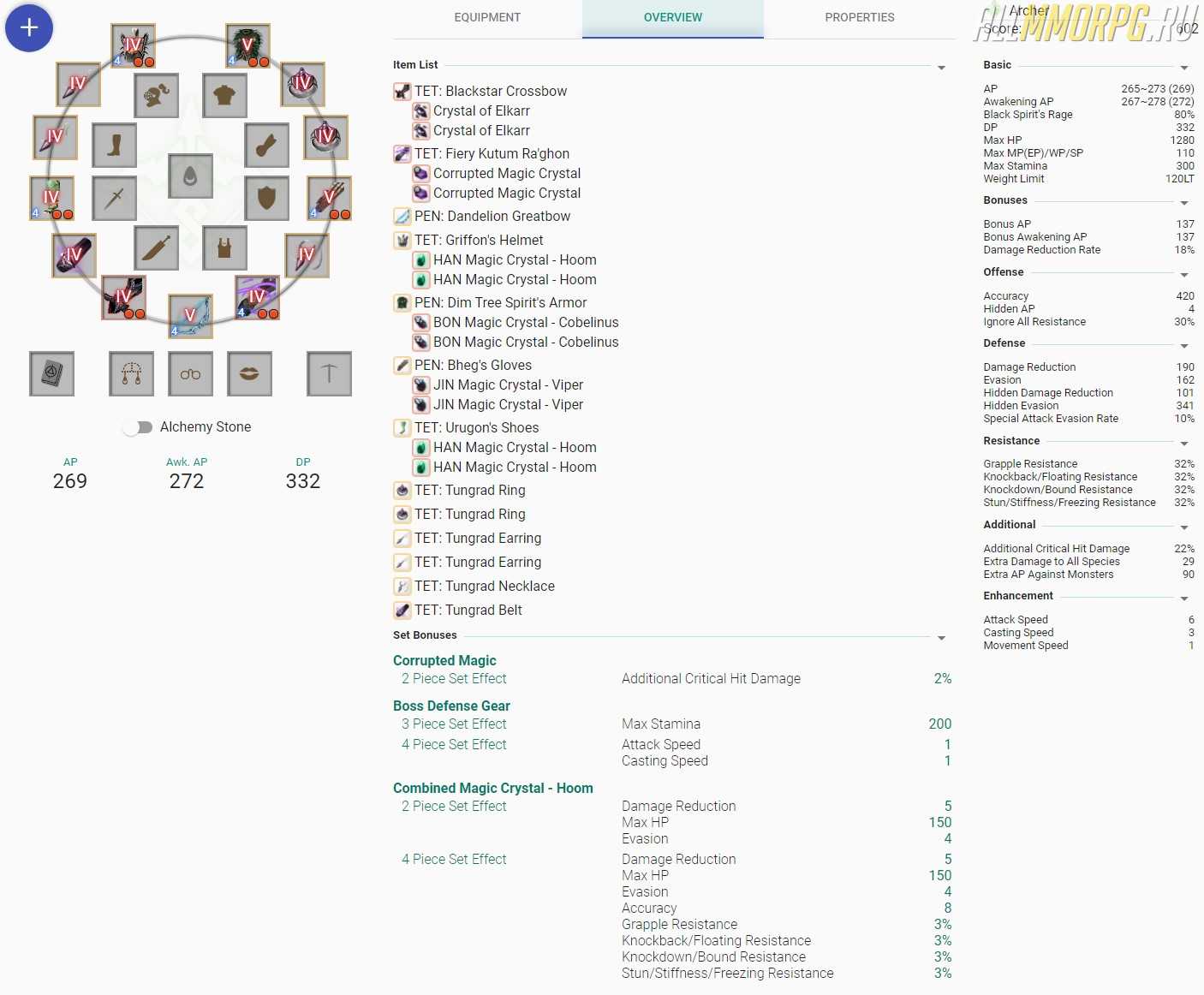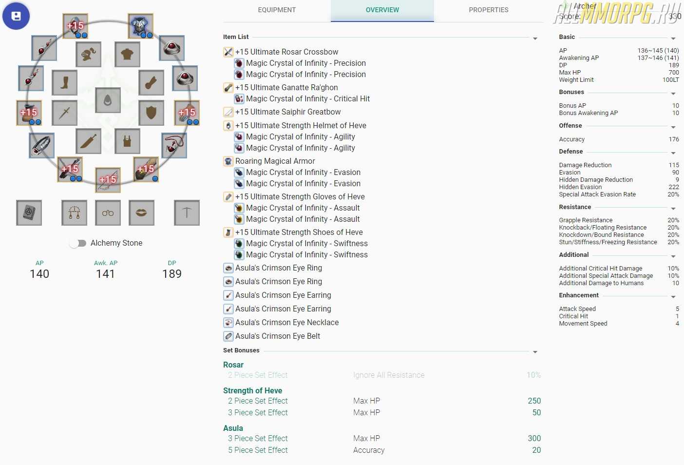 Конечная точка процесса подбора экипировки. Развитие персонажа до этого уровня займет немало времени и усилий, но в результате вы будете комфортно чувствовать себя в высокоуровневом PvP. Не забудьте улучшить экипировку камнями Кафраса. Также вы можете заменить оба Граната III [МЕТКОСТЬ] на Кристалл Элькара (конечно, если сможете их добыть).