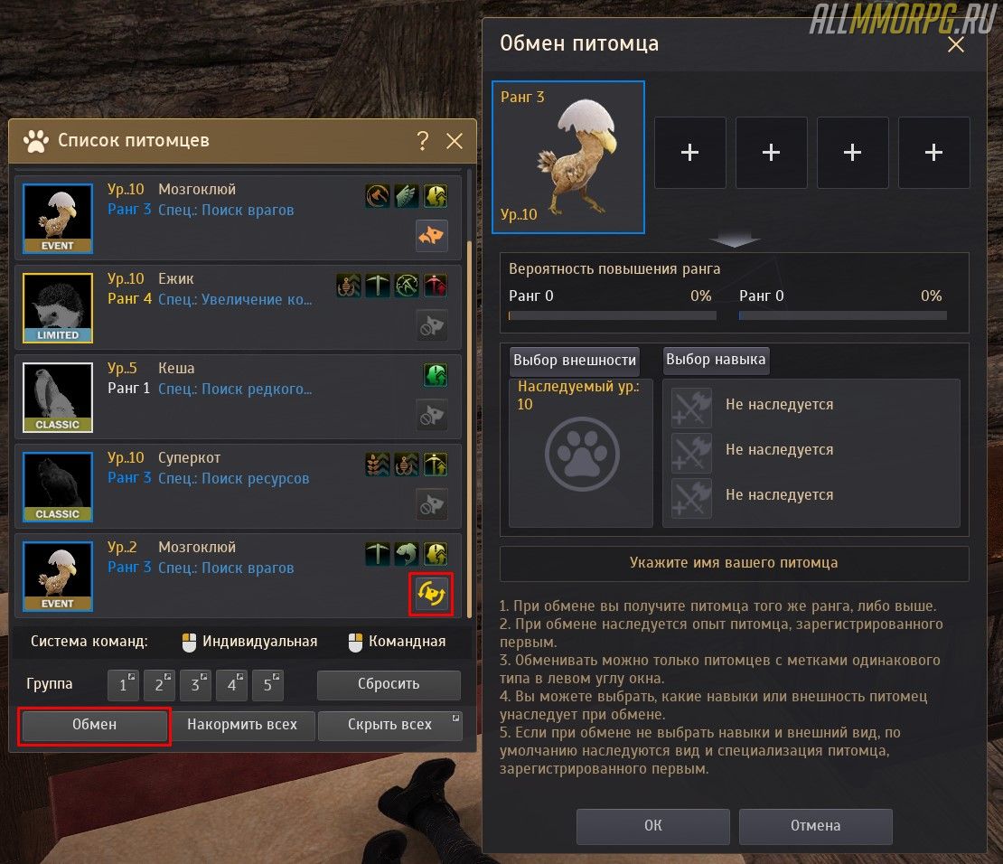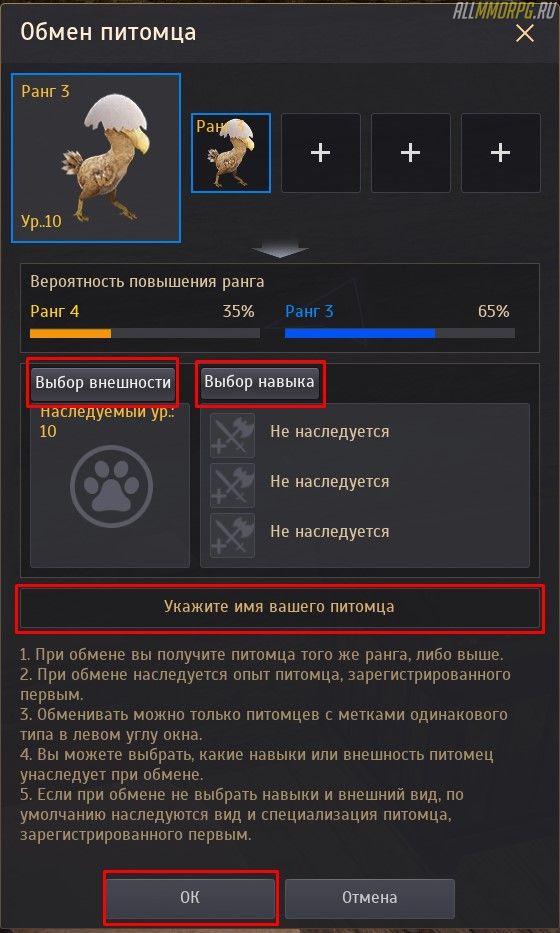 - Отметьте вариант внешнего вида и умения, которые вы хотите сохранить. Если получившийся в результате обмена питомец получит более высокий ранг, он получит дополнительное умение, которое будет определено случайным образом.