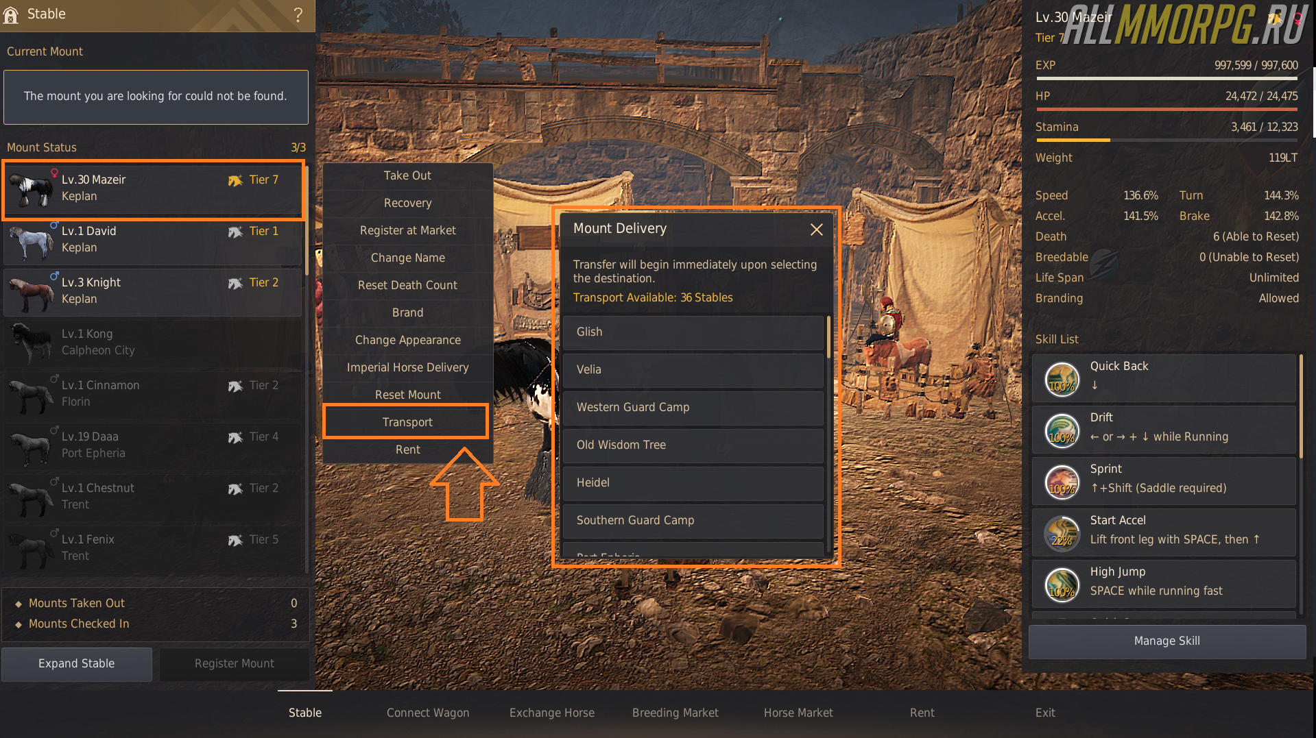 Эта услуга позволяет переместить любой транспорт (в том числе повозки) из одного города в другой. Перемещение стоит 100 000 серебряных и занимает 10 минут, независимо от расстояния. Чтобы переместить свой транспорт, подойдите к конюшне, в которой он находится, выберите нужный пункт и нажмите кнопку "Переместить". Выберите место назначения и нажмите кнопку "ОК". После подтверждения отменить перемещение будет нельзя.