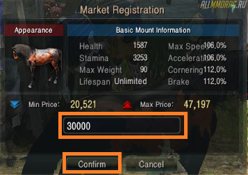 Чтобы выставить на торги свою лошадь, нажмите кнопку "Регистрация" Введите цену и нажмите кнопку "ОК". Цена на любую лошадь ограничивается предложениями других игроков. Например, лошадь со скриншота можно продать за 20 521 - 47 197 серебряных.