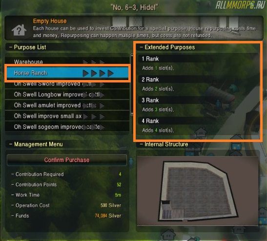 Изначально стойло вмещает в себя три единицы транспорта. Если вам требуются дополнительные слоты, придется купить лошадиное ранчо. В каждом городе или деревне можно купить всего одно ранчо, на каждом ранчо есть место для четырех лошадей. Чтобы купить ранчо, нажмите на иконку города, найдите собственность нужного типа и нажмите кнопку "Приобрести". Перед приобретением ранчо необходимо купить связанные с ним дома.