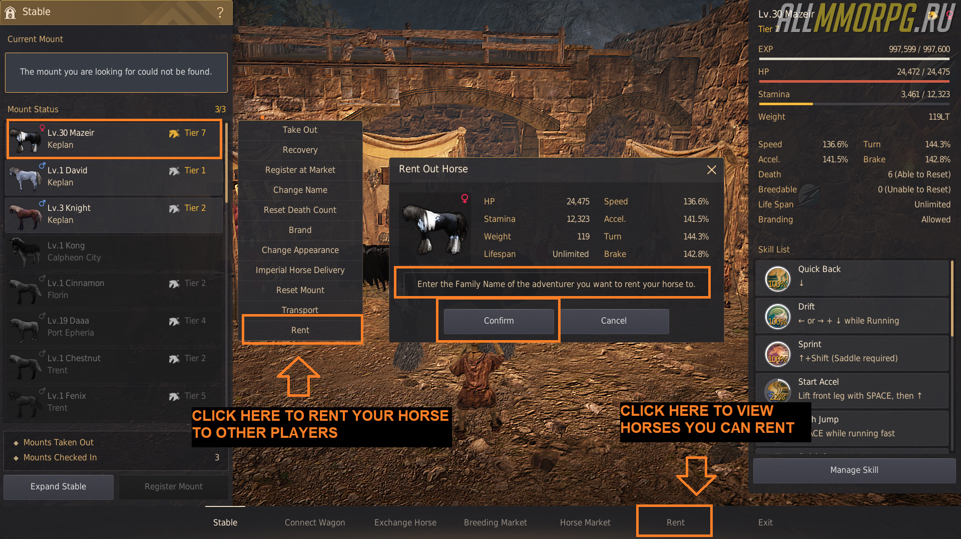 Чтобы взять лошадь напрокат, подойдите к конюху и выберите в диалоге пункт "Аренда". В открывшемся окне выберите пункт "Список лошадей", чтобы посмотреть доступные варианты.
