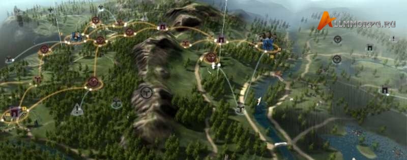 Маршрут или последовательность узлов всегда начинается в городе или деревне. Города и деревни открываются автоматически, и в них не нужно вкладывать очки влияния. Узлы приключений, которые можно связать между собой, соединены белыми линиями на карте. Узлы, которые уже были связаны, соединяются желтыми линиями.