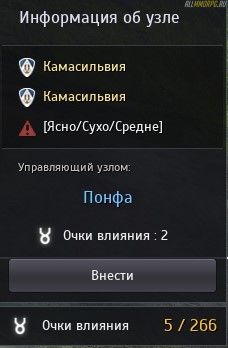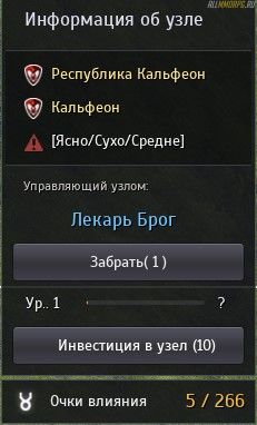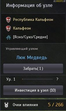 В левом верхнем углу окна информации об узле указывается название региона и имя управляющего узлом, а также количество очков влияния, которое нужно вложить, чтобы вписать узел в маршрут.