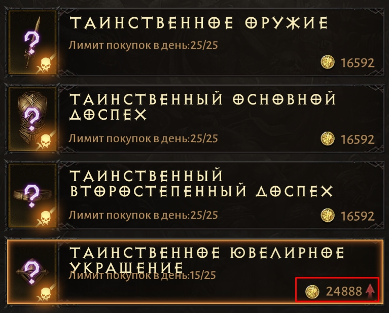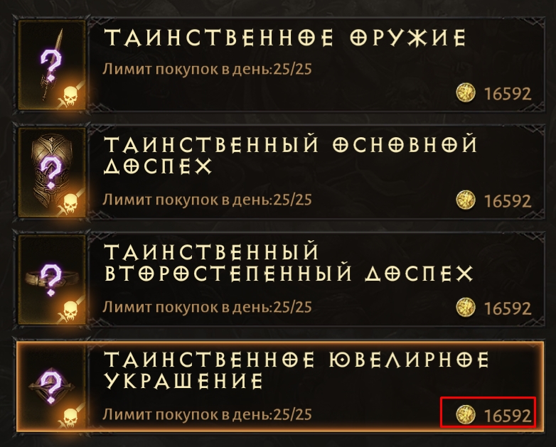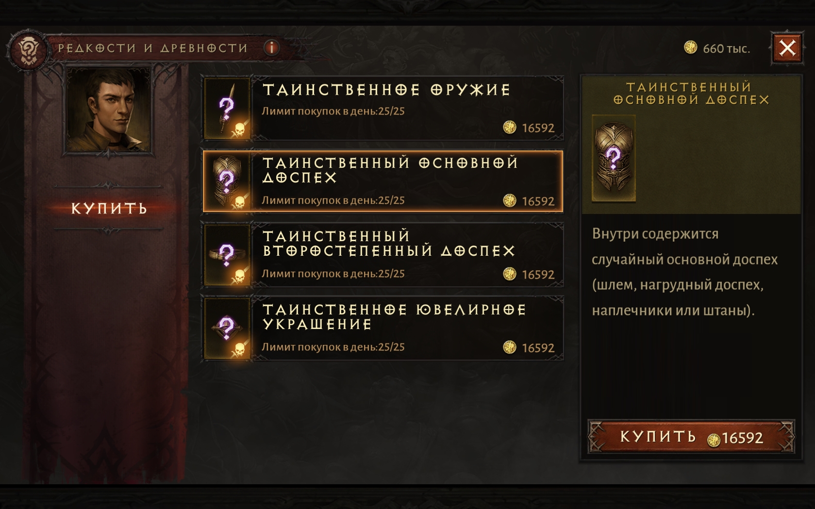 Почему больше не стоит покупать предметы для слотов «Оружие», «Шлем», «Нагрудник», «Наплечник» и «Штаны»? Потому что шанс выпадения легендарного предмета из Таинственных доспехов и Таинственного оружия крайне низок. Вы попросту потратите золото в никуда и не получите ничего полезного. К тому же, на 60 уровне у героя уже будут легендарные предметы для этих ячеек, которых пока достаточно для прокачки первых уровней парагона (совершенствования).