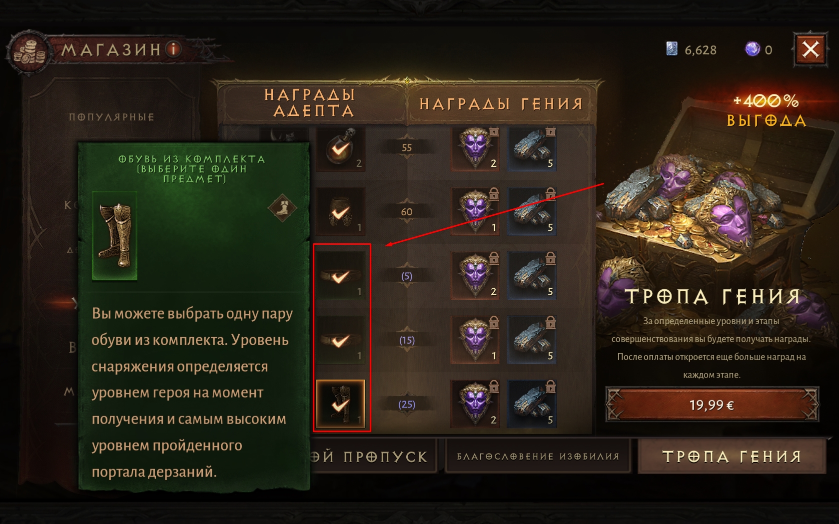 Важно! На 60 уровне не заморачивайтесь с поиском подходящего пояса и сапогов. Вы получите зеленые комплектные предметы с Тропы гения по достижению определенного уровня парагона (совершенствования) – 5, 15, 25 и 30 ур. Они дают полезные бонусы для вашего класса и намного качественнее, чем любая экипировка желтого цвета.