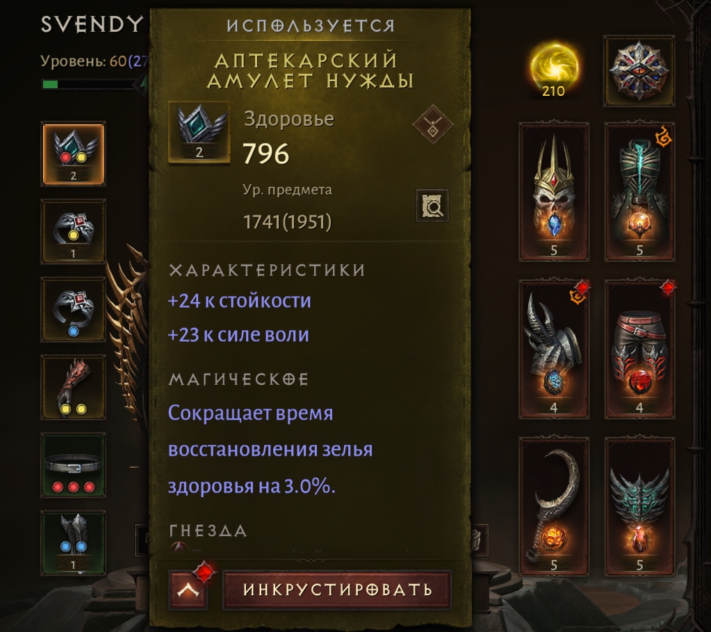 К финалу сюжетной кампании у героя уже будет 60 уровень (максимальный без парагона). Теперь вам надо покупать у Якина украшения и вторичные доспехи: амулет, кольца, сапоги и другие предметы для слотов, находящихся в левой части окна информации о персонаже.