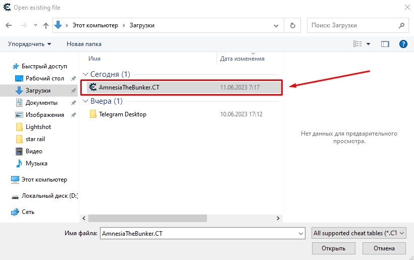 - Выберите файл «AmnesiaTheBunker.CT» и нажмите «Открыть»;
