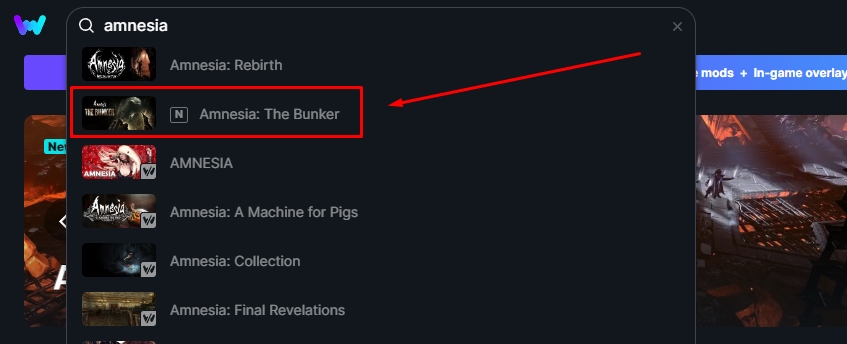 - В левом верхнем углу окна программы нажмите на строку поиска и введите название игры «Amnesia: The Bunker»;