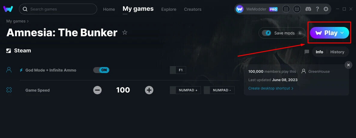 - Если игра установлена из официального источника, кнопка «Play» справа вверху будет активна. Нажмите ее и дождитесь запуска Амнезии: Бункер;