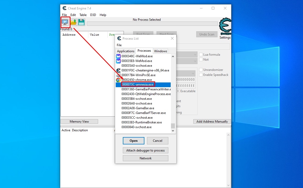 - Когда игровой клиент откроется, вернитесь в окно Cheat Engine и нажмите на значок монитора (справа вверху под кнопкой «File»);