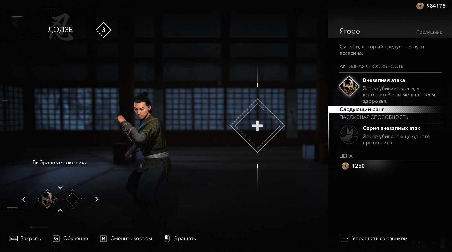 Для повышения его ранга нажмите пробел на экране просмотра активных союзников, а потом потратьте 1250 монет на прокачку до 2 уровня («Посвященный»). Следующий и последний ранг – «Ветеран». Его разблокировка стоит 2850 монет.