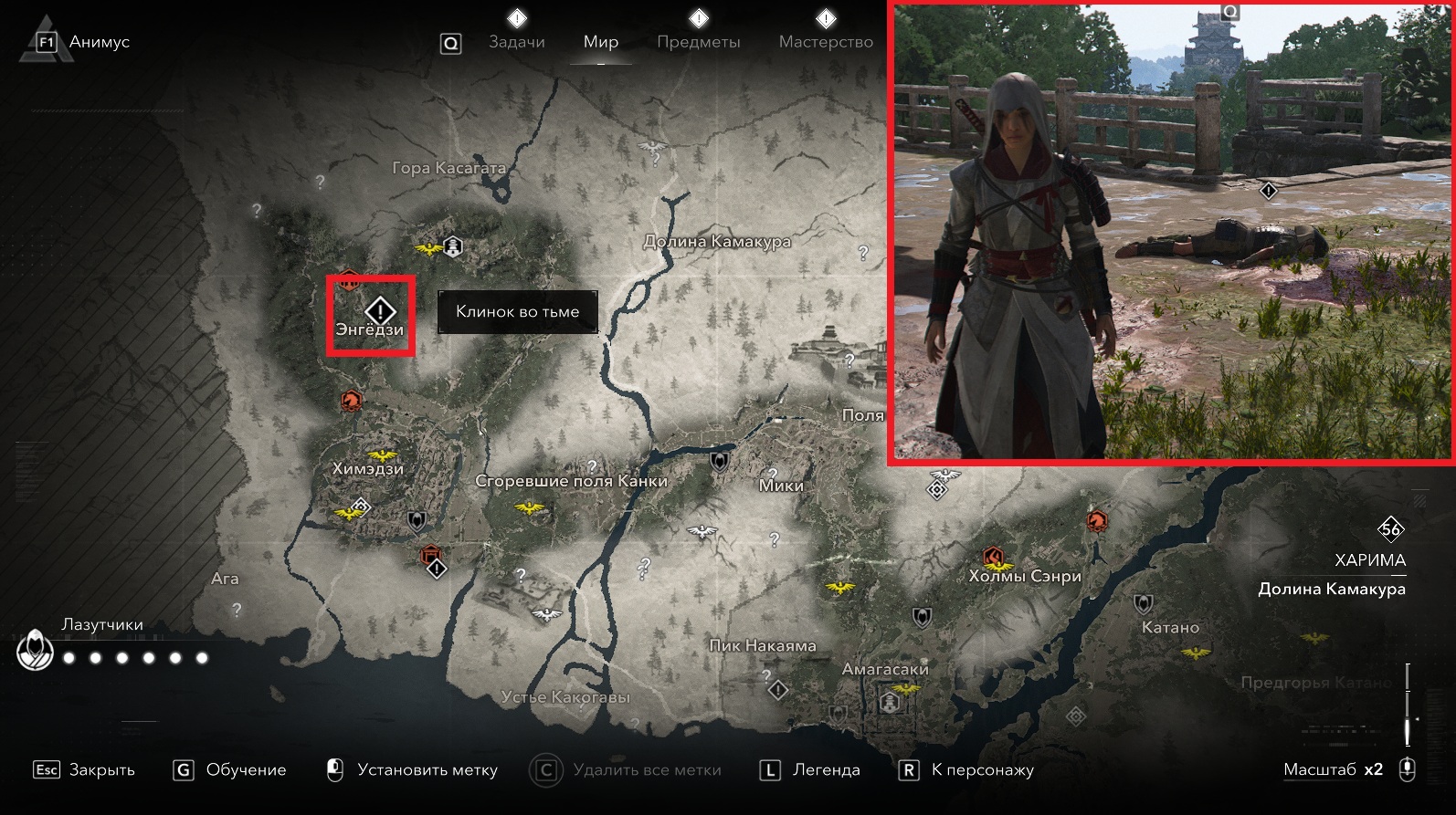 Далее отправляйтесь в Хариму и найдите в области Энгёдзи маркер побочной миссии «Клинок во тьме». Если его на карте нет, то подойдите поближе к Залу Манидэн, и тогда он начнет отображаться.