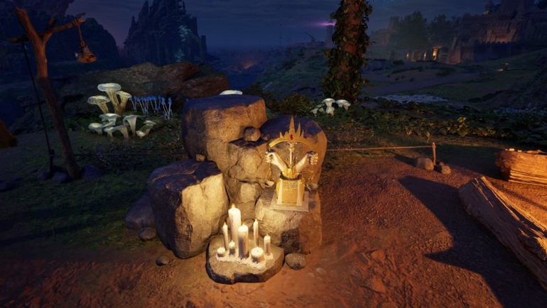 - “Идол тайных заговоров”: теперь необходимо отправиться на просторы локации “Мрачные заболоченные земли” и исследуйте “Северо-западную часть”. Ориентиром послужит разрушенное здание, куда вам необходимо попасть. Сделать это можно с помощью крыши, где есть проем. Внутри вы найдете алтарь, где под ветками будет нужный вам идол.