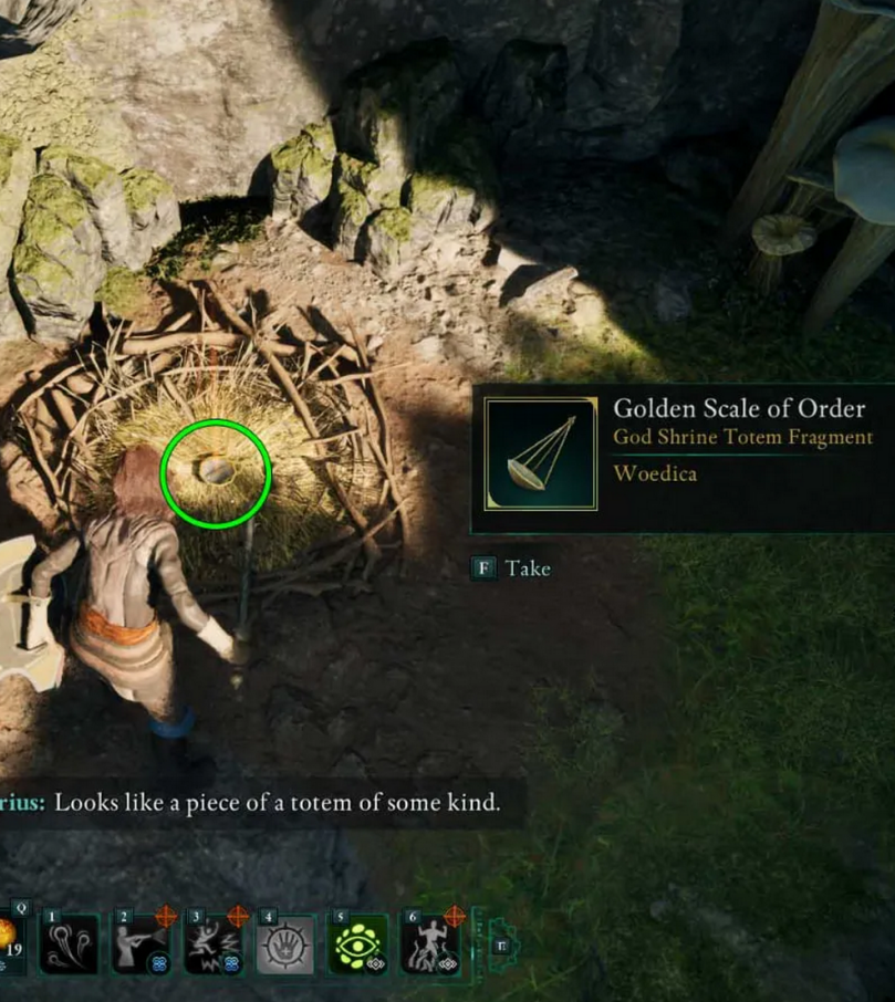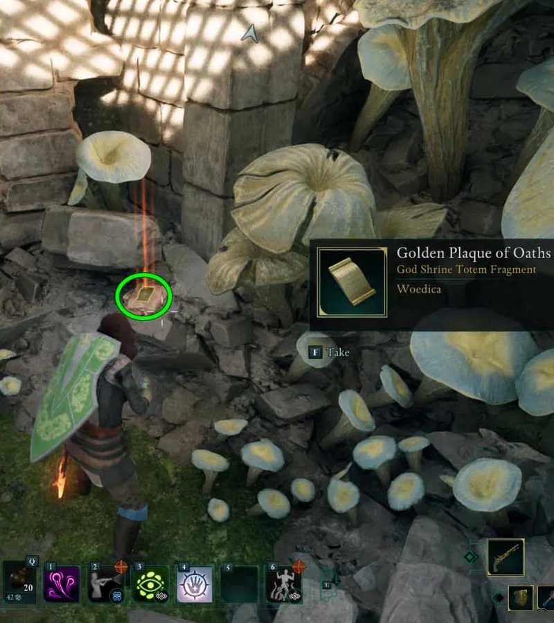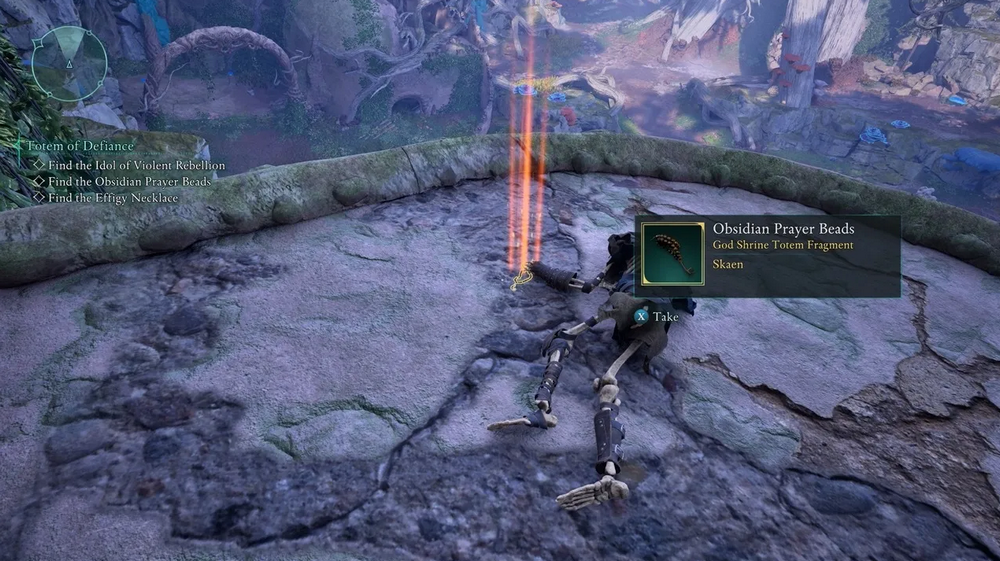 - “Основа тотема”: для начала отправляемся на поиски главной составляющей части артефакта. Направляйтесь в место под названием “Алтарь Скейна”. Там вам необходимо забрать основу с пьедестала, а для этого просто ориентируйтесь на мост. Не переходите по нему, обратите внимание на поляну слева от него, вскарабкайтесь туда и вы обнаружите желаемый предмет.