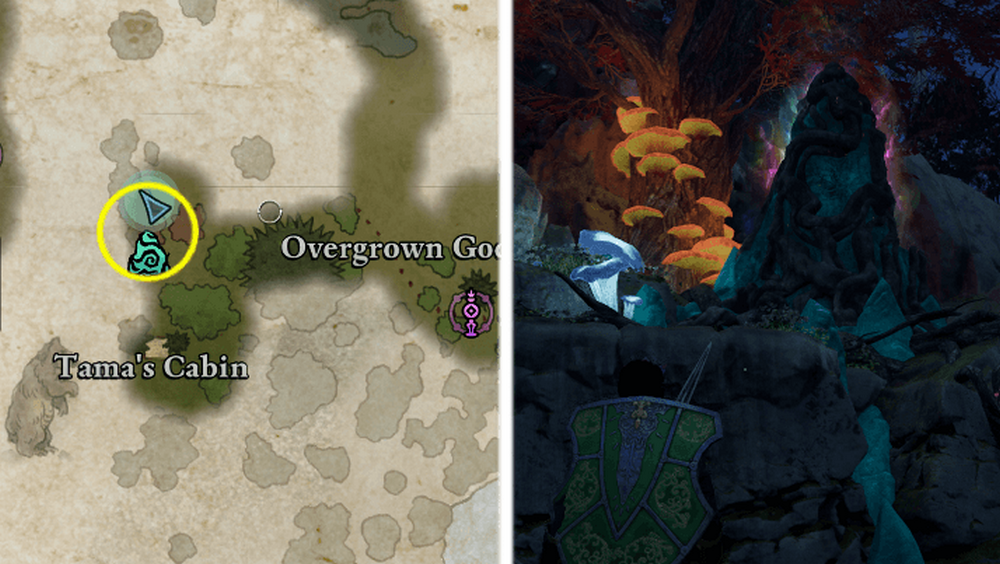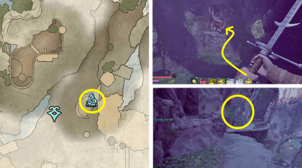 - От него нужно следовать в северном направлении и внимательно смотреть по сторонам. Необходимо найти пещеру, которая будет вся покрыта корнями (во время вашего передвижения она располагается с левой стороны).