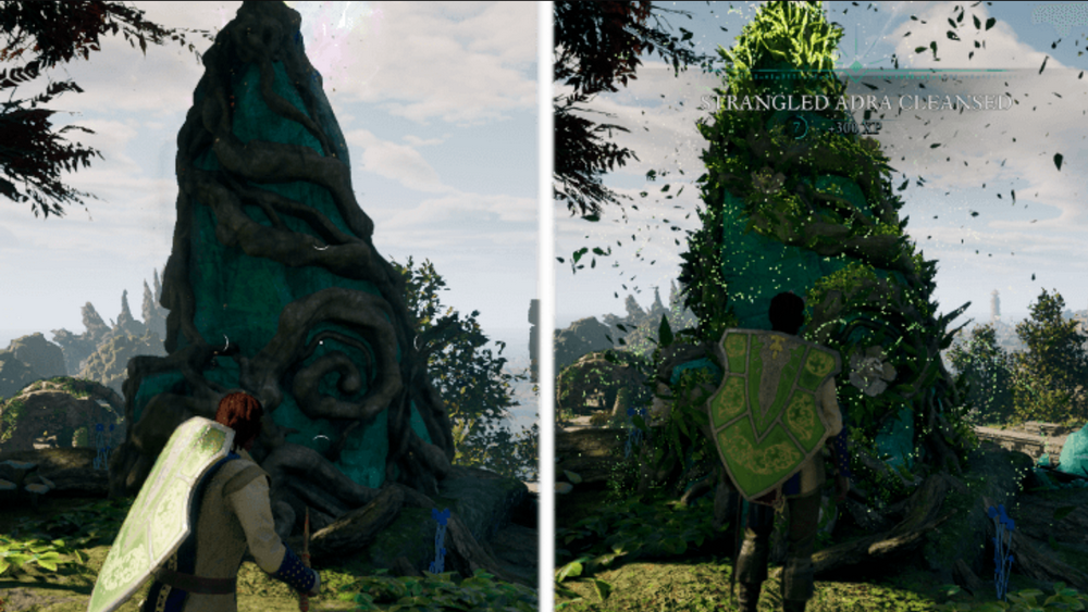 Адра представляет собой священные камни, которые необходимо очистить перед тем, как использовать их силу. После того, как отыщите нужное место, то увидите, что каменная статуя как будто задушена растениями и неактивна. Поэтому для очищения вам достаточно просто начать взаимодействовать с Адрой. После этого начнется диалог с Сападалом, а как только он закончится, то вы увидите, что камень расцветает. Это и будет означать его очищение, за которое вы получите весомое количество опыта.