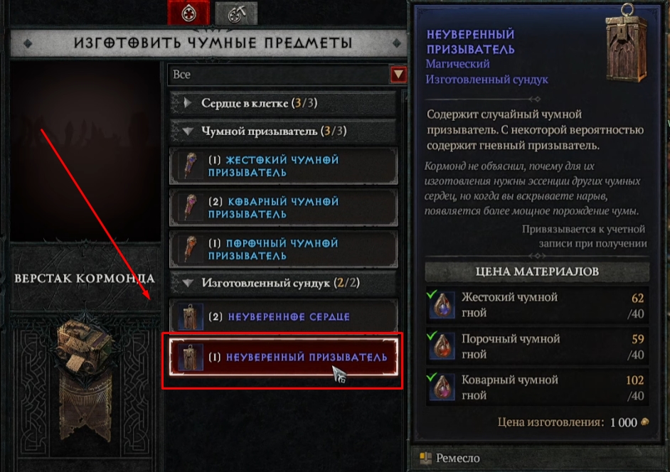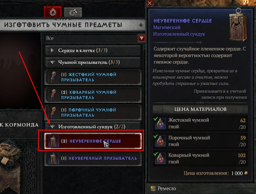 - Создать на верстаке Кормонда. Вы можете изготовить случайный камень определенного типа самостоятельно. На сегодняшний день для крафта доступны только три вида чумных сердец: Коварный, Порочный и Жестокий. Гневный создать не получится. Для крафта чумных сердец вам требуется чумной гной определенных типов: