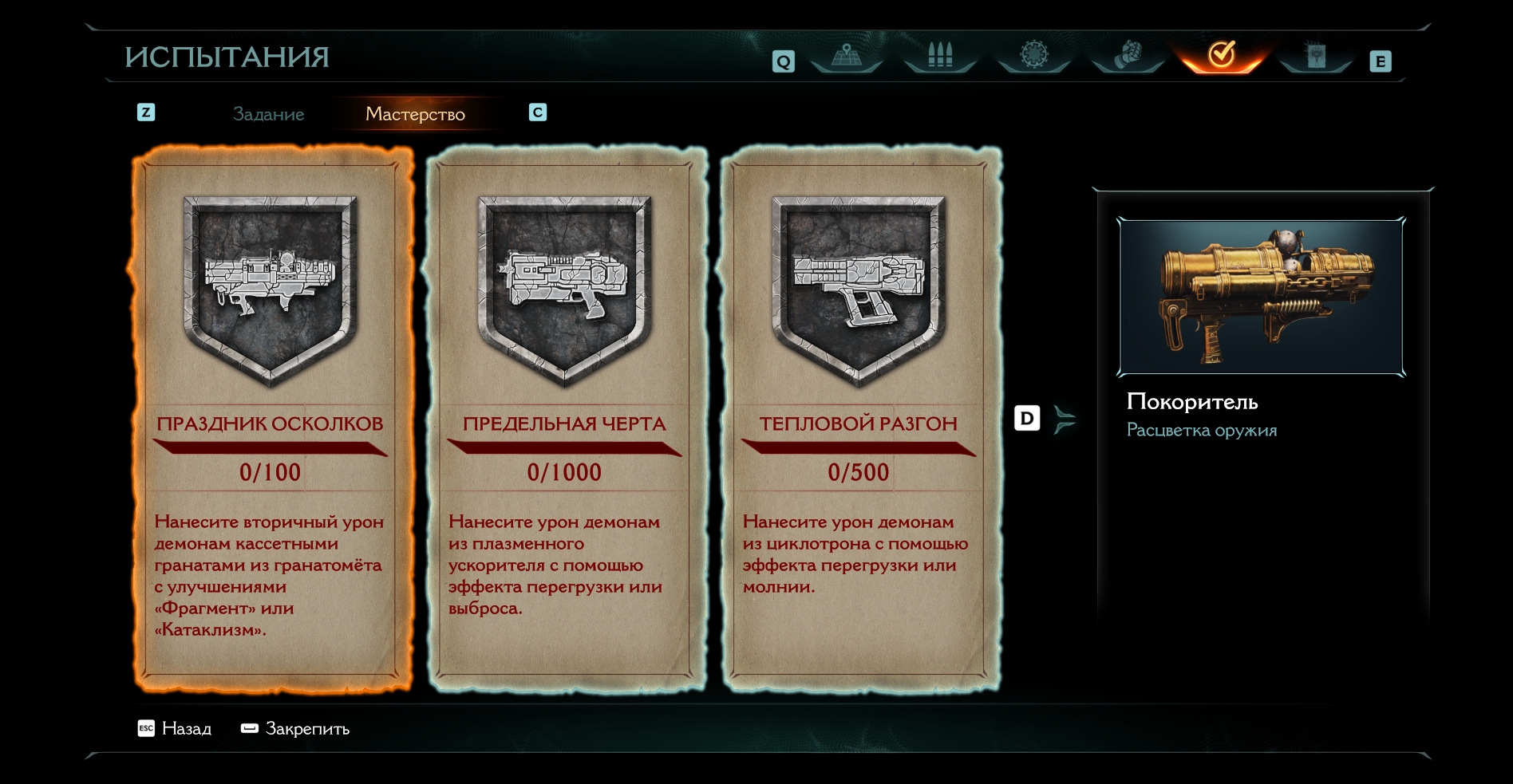 После прохождения всех глав у вас будет возможность пройти испытания мастерства – для этого улучшите все типы оружия Палача рока на максимум. Найти эти доп. квесты можно в том же разделе, где перечислены испытания в заданиях (вторая вкладка).
