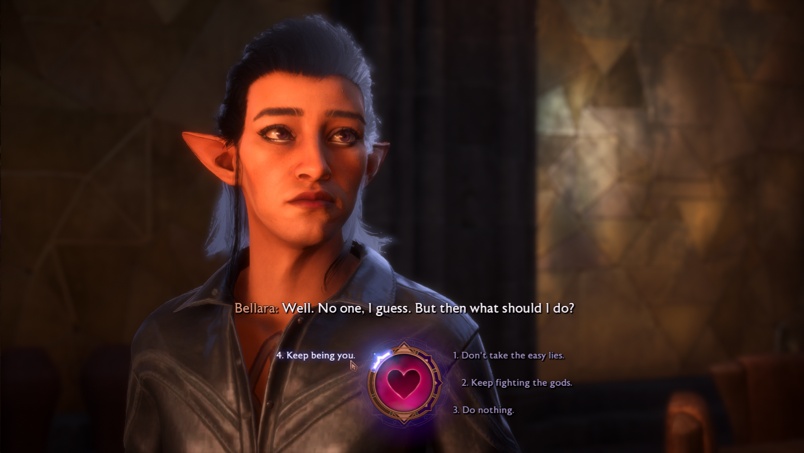 Эльфийка весьма заинтересована в изучении магии древних артефактов, а потому в диалогах лучше всего поддерживать ее интерес, чтобы можно было быстрее приступить к развитию романа. Несмотря на ее принадлежность к Завесным Странникам, никаких ограничений со стороны ее фракции не будет.