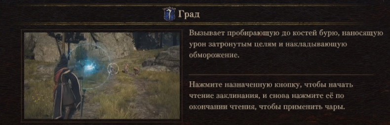 «Град» наносит АОЕ урон льдом и накладывает на противников дебафф Обморожение. Этот негативный эффект заставляет цель двигаться гораздо медленнее, что позволит сдерживать натиск врагов. Кроме того, вам будет намного проще оторваться от преследователей, если они лишены возможности бежать за героем и его спутниками.