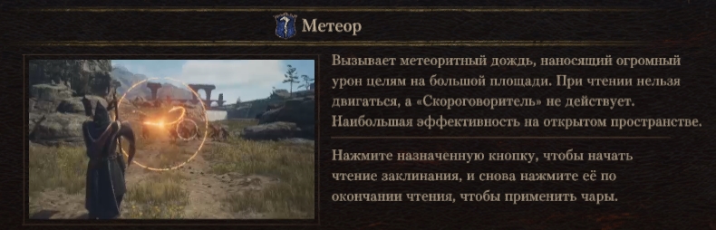 «Метеор» – высшая способность призвания Чародей, призывающая метеоритный дождь. Падающие с неба метеоры наносят огромный урон всем врагам, стоящим в определенной области. Во время применения навыка герой не может двигаться и пользоваться «Скороговорителем». Наибольшая эффективность заклинания достигается, когда оно используется на открытом пространстве.