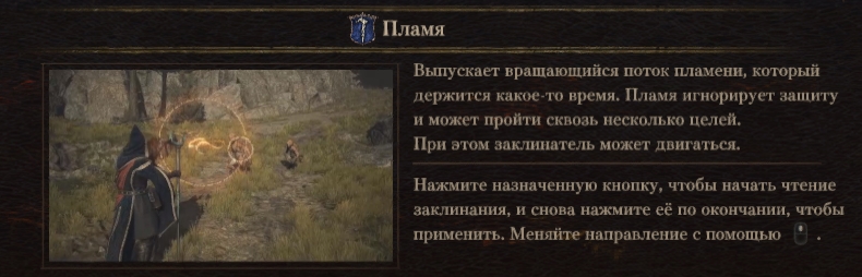 - Герой выпускает поток пламени, который обжигает стоящих впереди врагов, нанося им урон от огня. Пламя проходит сквозь цели, игнорирует их защиту и позволяет Чародею двигаться.