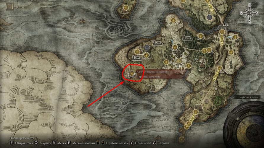 - Воспользуйтесь наши скриншотом, где отмечено местоположение Торговца-затворника (Плачущий остров).