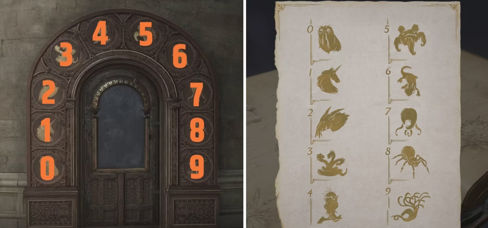 Двери с нумерологическими головоломками встречаются в Hogwarts Legacy сравнительно часто. Начать разгадку стоит с кода - благо, он сравнительно прост и находится на виду. Как видно на скриншоте, арка над дверью украшена десятью иконками, каждая иконка соответствует одному числу из первой десятки (единорог - единица, паук - восемь и так далее). Иконки выстроены по порядку: слева направо, от нуля до девяти.