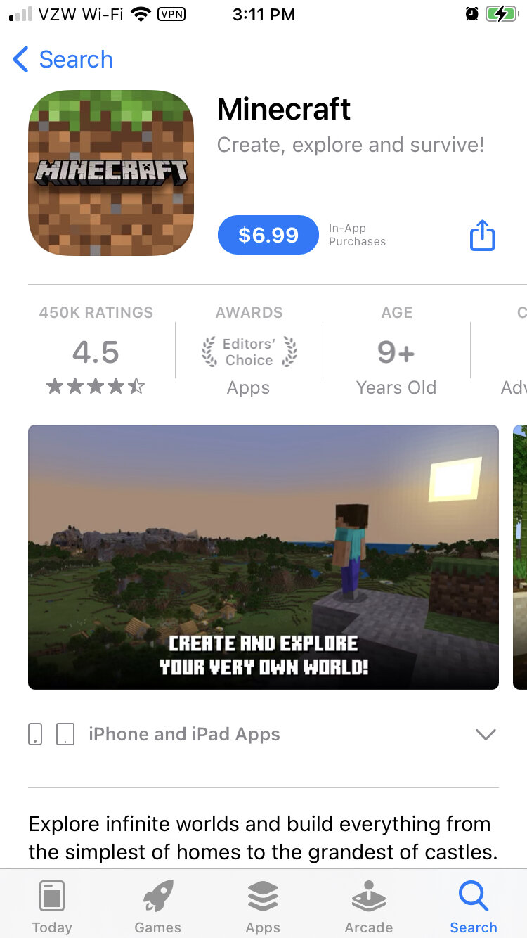 - В конце найдите Майнкрафт в Апп Стор, купите его, после чего скачайте и наслаждайтесь игрой.