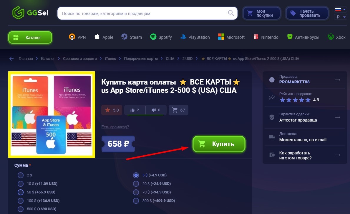 - Пополнить баланс App Store можно с помощью мобильного оператора Билайн. Если у вас нет этого оператора или оплата через Билайн не проходит, воспользуйтесь подарочными картами. Подарочные карты можно купить в интернете, к примеру, на сайте GGSel. Введите в строке поиска «Подарочная карта App Store & iTunes» и выберите подходящее вам предложение. К примеру, если вы сменили регион в учетной записи Apple на США, то выбирайте продавцов, которые продают пополняшки в долларах. Майнкрафт в Апп Стор стоит 6,99$, поэтому вам нужно купить две карты на 5$ + 2$ или одну карту на 10$, которая стоит чуть больше 1000р.;
