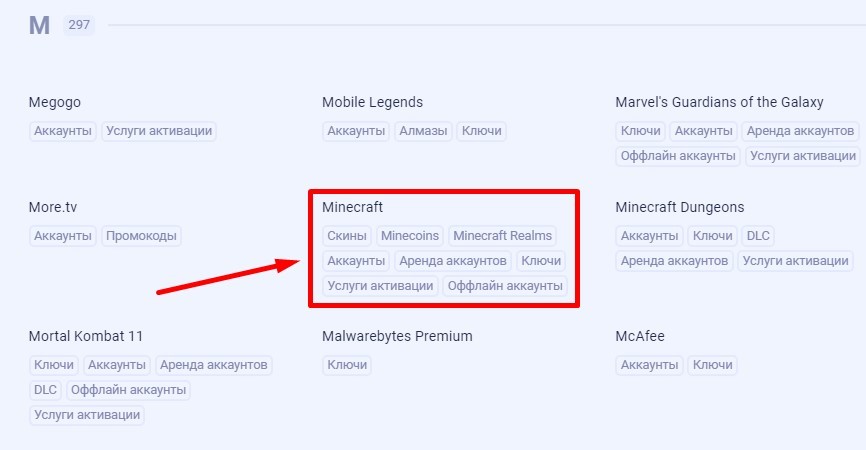 - Перейдите на GGSel и в списке игр найдите Minecraft;