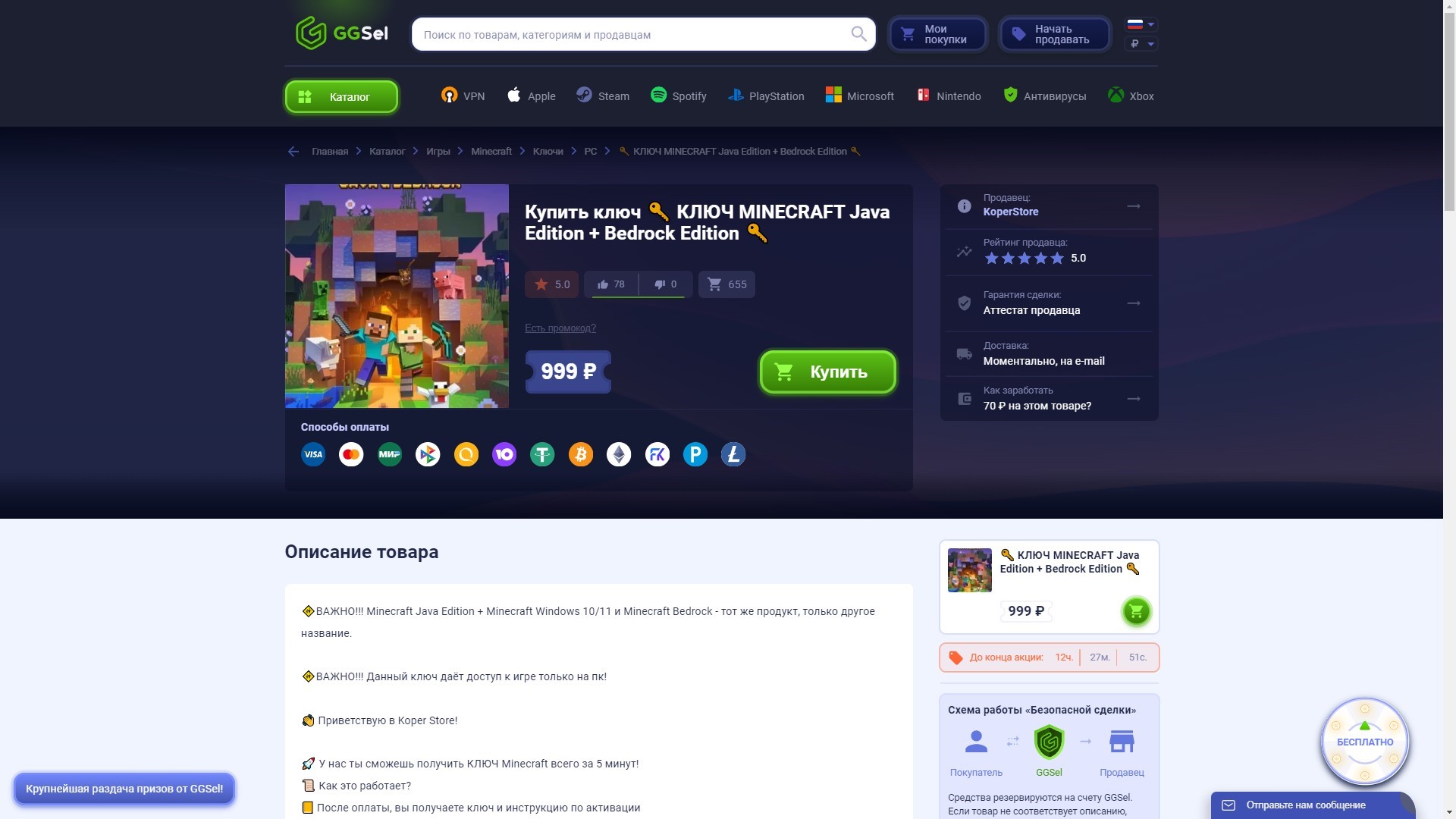 - Купите у частных торговцев карты с кодом пополнения баланса для выбранного региона. Вы найдете их в таких онлайн-маркетах из разряда GGSel. Примерная цена карты на 10$ – 800 рублей. Чтобы купить базовое лицензионное издание Minecraft, вам придется потратить около 1600 рублей, так как его цена – 19,99$. Более точную цену можно посмотреть в момент покупки;