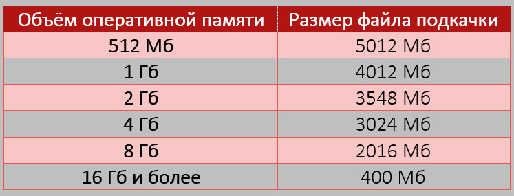 Обычно объем файла подкачки выбирается «на глаз». В целом, каких-либо особых форм расчета, каким должен быть файл подкачки, нет. Поэтому вы можете ориентироваться по этой таблице: