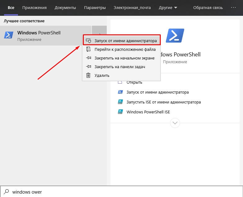 - Найдите на своем компьютере Windows Power Shell и запустите его от имени администратора;