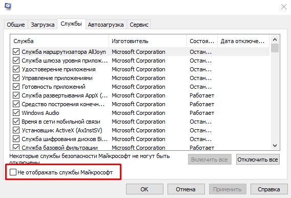 - Перейдите на вкладку «Службы» и поставьте флажок рядом со строкой «Не отображать службы Microsoft». Так вы скроете все службы, которые обязательно должны быть запущены для корректной работы операционной системы, и не отключите их случайно;