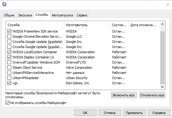 - После обновления списка активных служб отключите все, что вам не нужно, сняв рядом с их названием галочку;