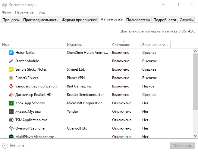 Далее откройте диспетчер задач и на вкладке «Автозагрузка» выключите все приложения, которые начинают работать сразу после запуска компьютера.