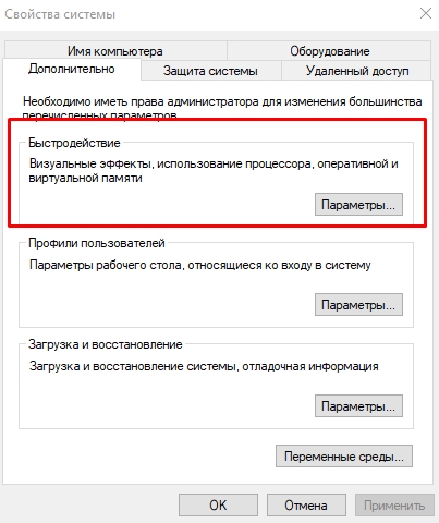 - В новом окне на вкладке «Дополнительно» перейдите на параметры быстродействия;