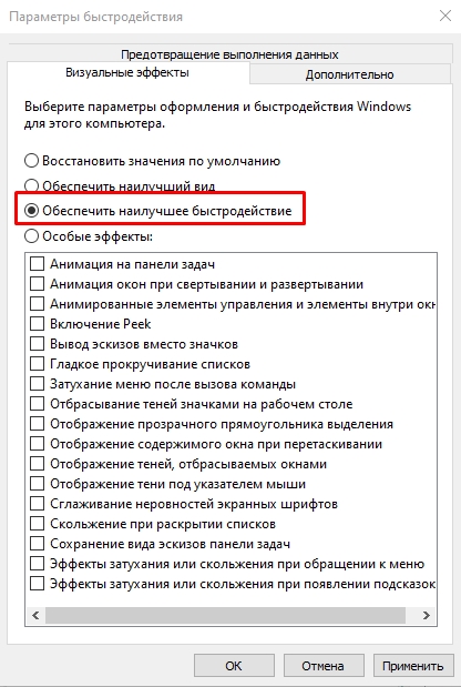 - Далее на вкладке «Визуальные эффекты» снимите все флажки с эффектов и анимаций, либо выберите «Обеспечить наилучшее быстродействие», после чего сохраните изменения.